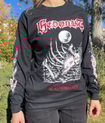 The art from their debut album released on Souther Lord) is printed on a black Gildan Ultra Cotton 100% cotton long sleeve shirt with white and red ink. Front and sleeve prints only.